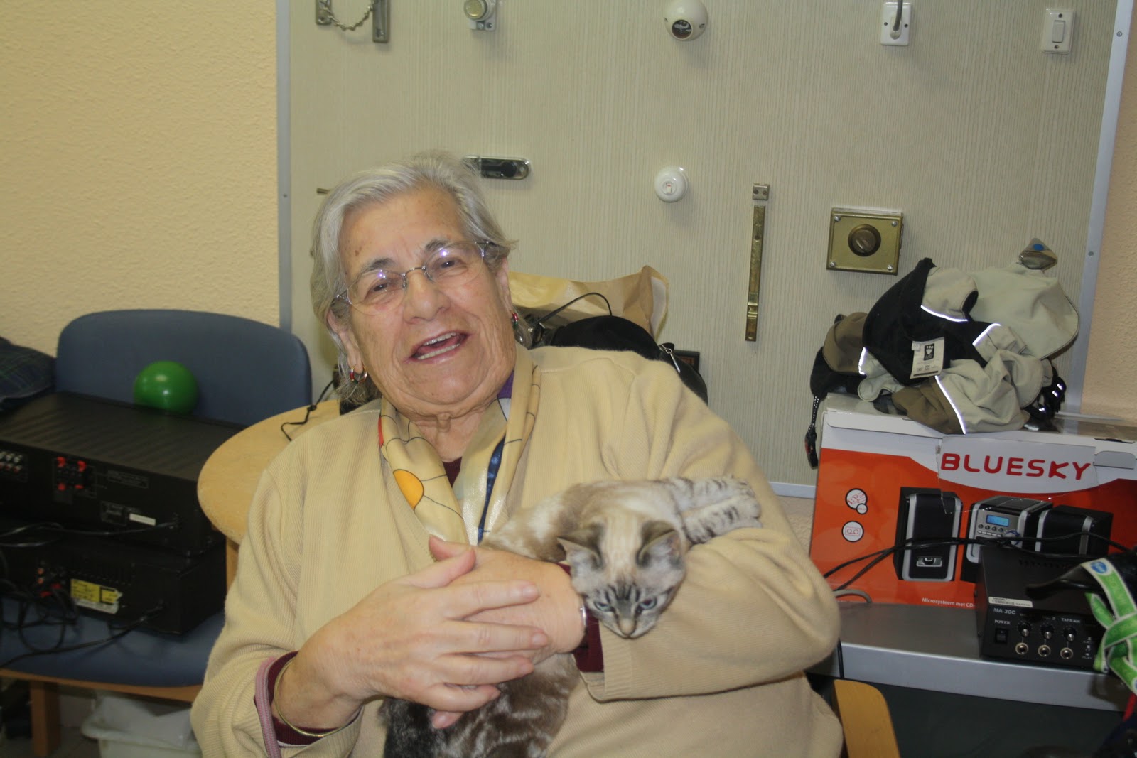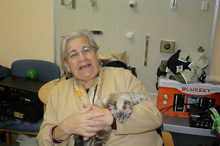 Al llegar al Centro me contaron que Manchas, el gato que ya había venido a la Residencia lo habían adoptado. Todos pensamos lo mismo, parece que todos los que hacen terapia encuentran esa familia que buscamos para ellos. Llevé a este cachorrito de gato y otro de perro, como ejercicio escribimos entre todos un cuento de Navidad en el que los protagonistas eran Navidad, el cachorro de mastín y Fiesta, el de gato.